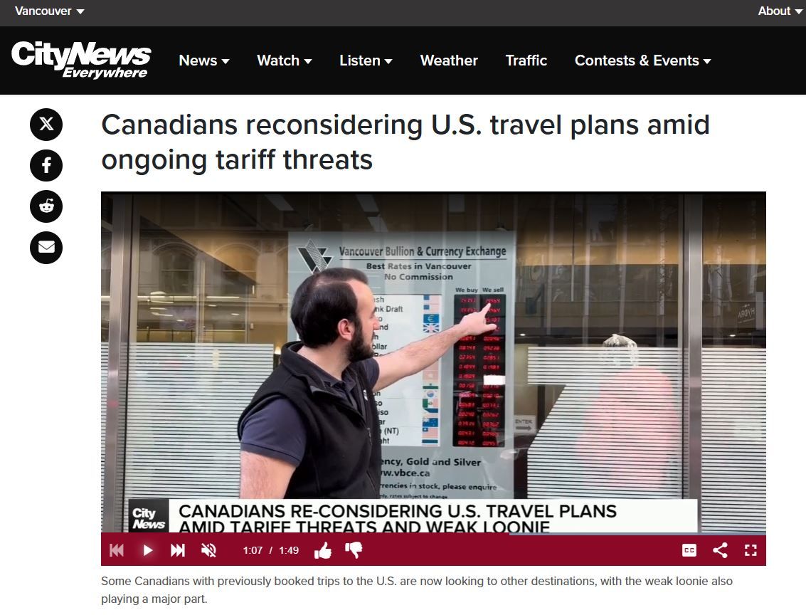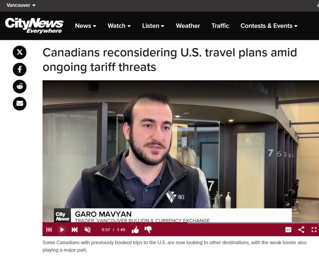 VBCE Trader Garo Mavyan spoke with Cecilia Hua from CityNews on February 7, 2025 on the changes he's observing as a FX Trader when it comes to destinations Canadians are selecting now for travel plans abroad.